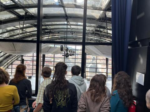En début d’après-midi, nous avons visité l’Opéra de Lyon en nous séparant en deux groupes, chacun accompagné d’un jeune guide passionné. Celui-ci avait à cœur de transmettre des connaissances architecturales, artistiques, techniques aussi bien que des anecdotes qui ont su piquer la curiosité de l’auditoire. Il s’agissait principalement de comprendre le projet de l’architecte Jean Nouvel, qui a conçu pour le public une invitation au voyage, le poussant à se défaire de ses repères avant d’accéder au spectacle. De la salle de répétition au sous-sol jusqu’au studio du ballet sous la verrière, nous avons parcouru de nombreux espaces. Un temps dédié à la grande salle a permis à chacun de se projeter en tant que spectateur pour la soirée à venir